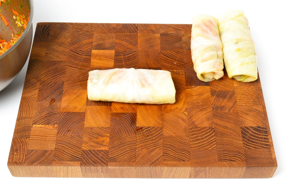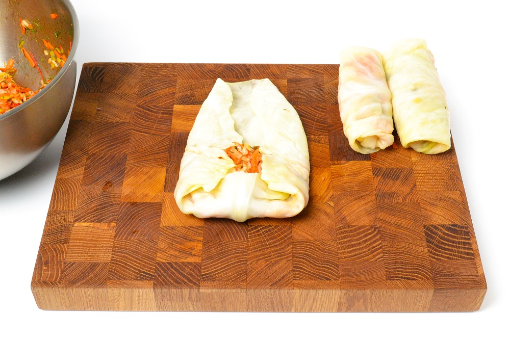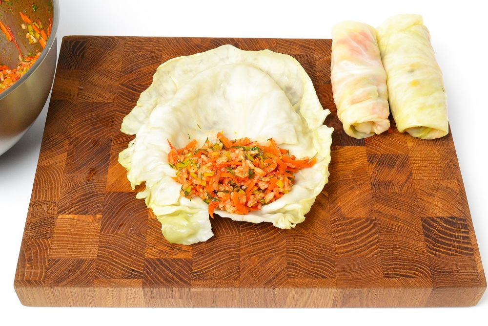 Свернуть голубец так, чтобы конец листа оказался снизу. Если капуста большая, часть листа можно немного подрезать, чтобы не получилось много оборотов.
