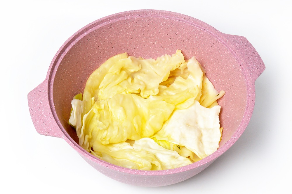 Дно жаровни застелить в 3-4 слоя оставшимися листьями капусты. Можно их немного порвать, чтобы подложка получилась более рыхлой и высокой. Она необходима для того, чтобы голубцы не подгорали и готовились равномерно.
