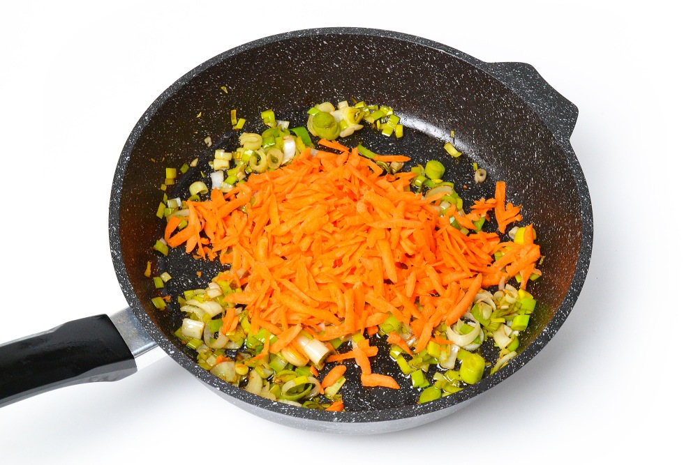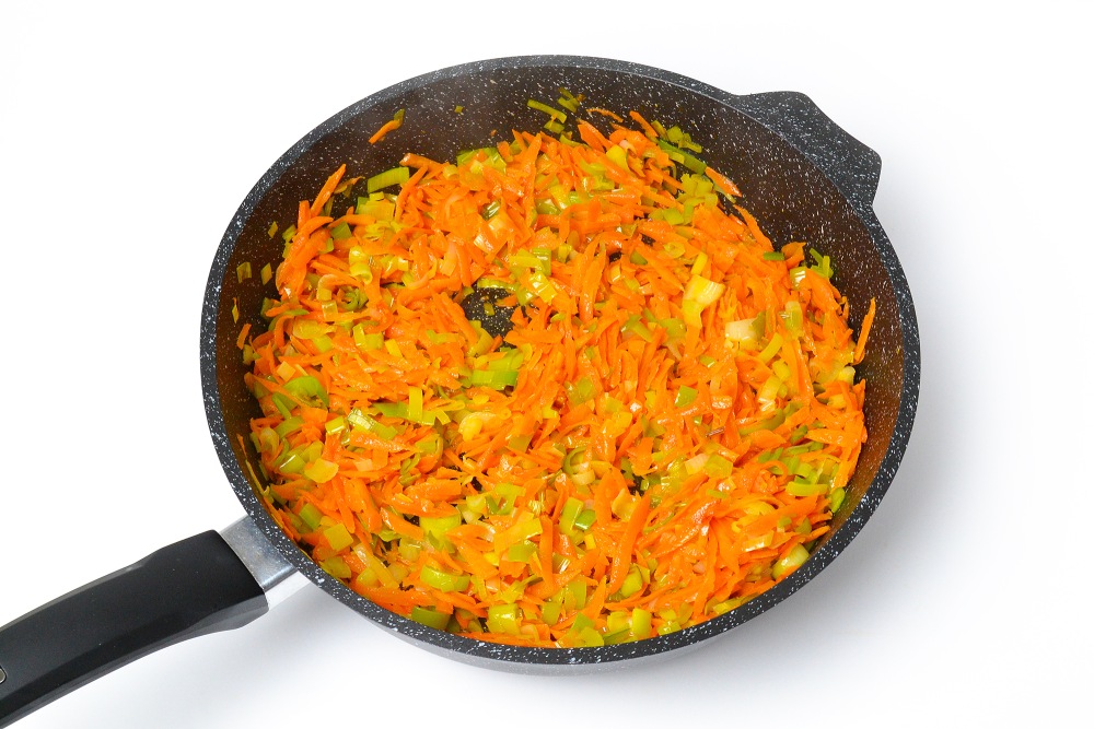 Морковь натереть на крупной терке и добавить к луку. Жарить еще 5-6 минут на огне чуть ниже максимального (5/6 для электроплиты). Отложить 2-3 ст. л. моркови для соуса.