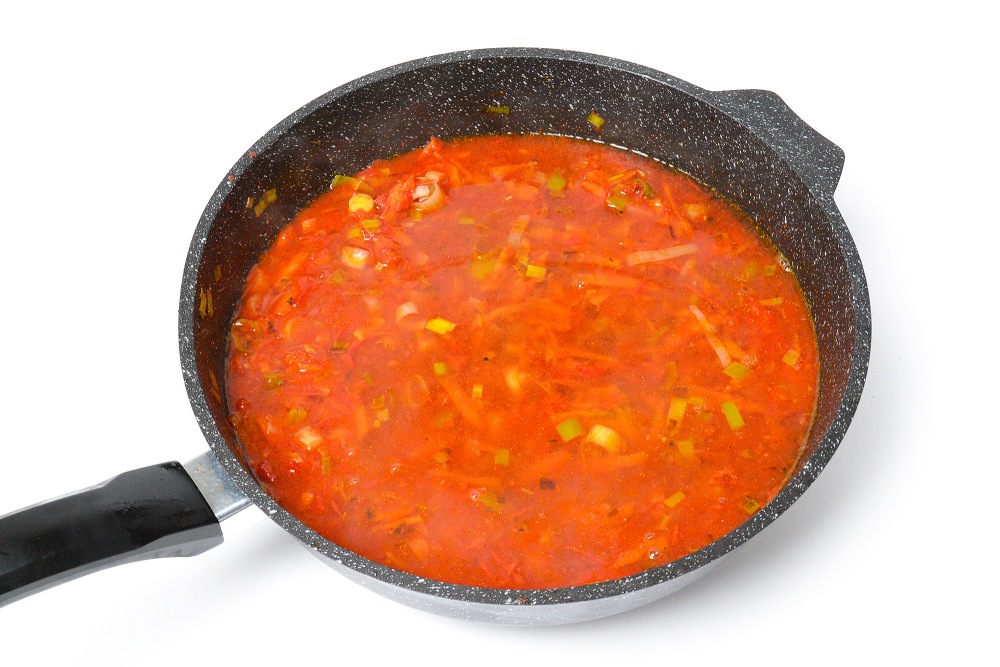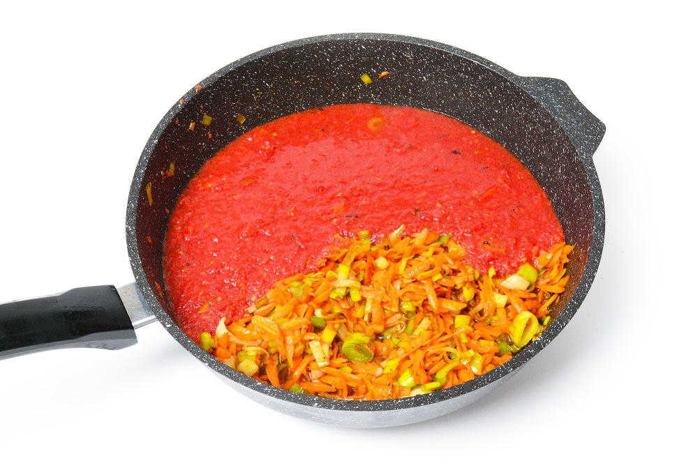 Лук-порей совсем не обязателен, подойдет и репчатый лук, и красный, и любой другой по вашему вкусу. Если замороженных помидоров нет, берите свежие – столько же по весу. Также для соуса можно использовать консервированное томатное пюре или пасту. Просто жидкости придется добавить больше или меньше. Я же использовала замороженные измельченные помидоры – для начинки откинула их на сито, чтобы стекла лишняя жидкость, а для соуса разморозила их без слива сока.