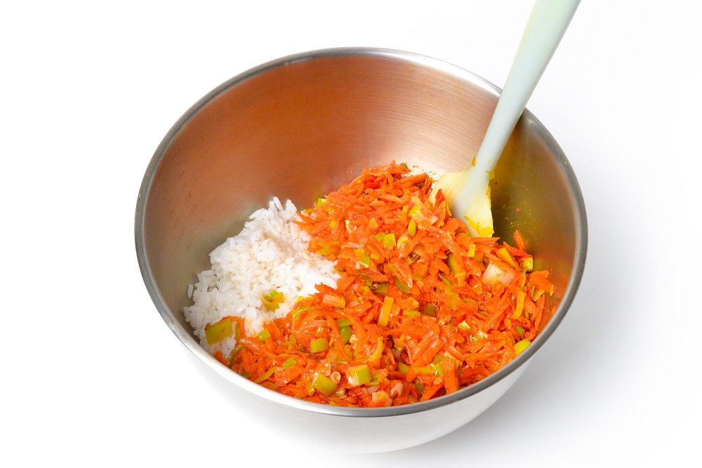В глубокой миске соединить вареный рис и обжаренные овощи.
