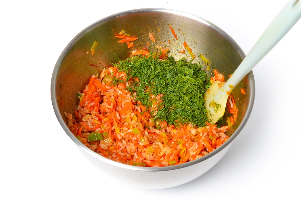 Мелко нарезанную зелень добавить в начинку.