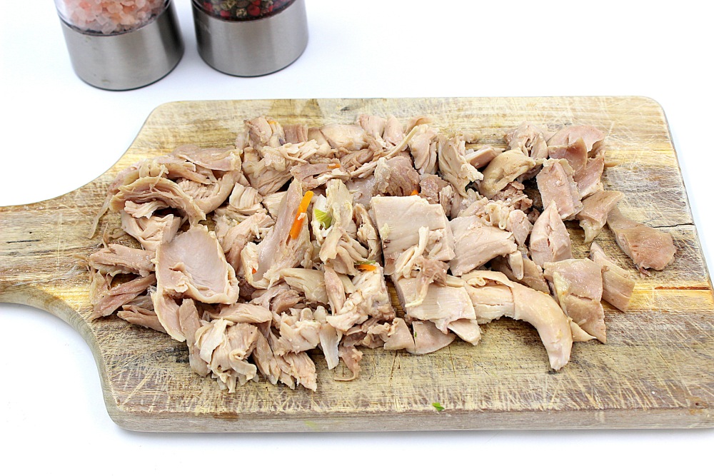 Выбрать курицу и добавить в кастрюлю пол литра воды, картофель, пассеровку, зеленый горошек и поперчить. Варить 10 минут.