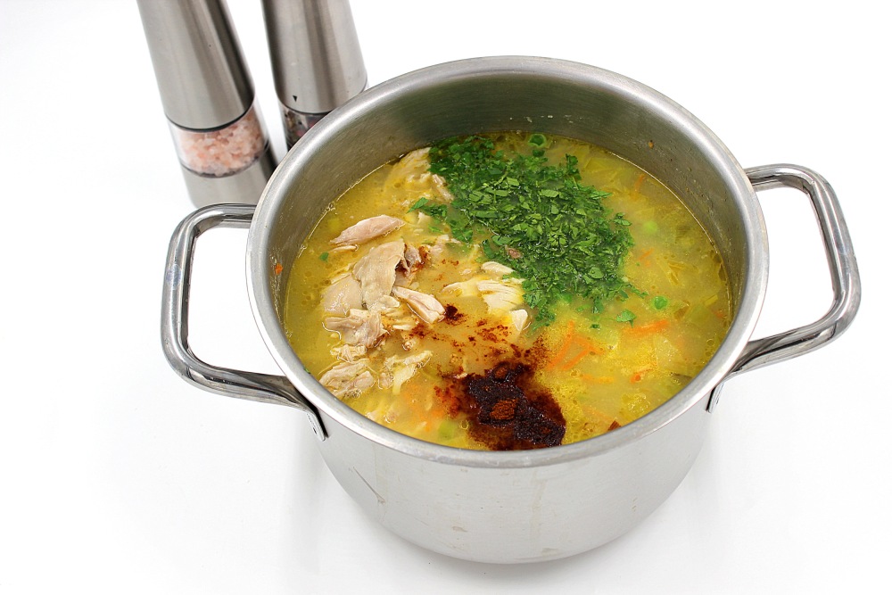 Добавить в кастрюлю курицу, копченую паприку и зелень. Попробовать на соль и варить ещё 2 минуты.