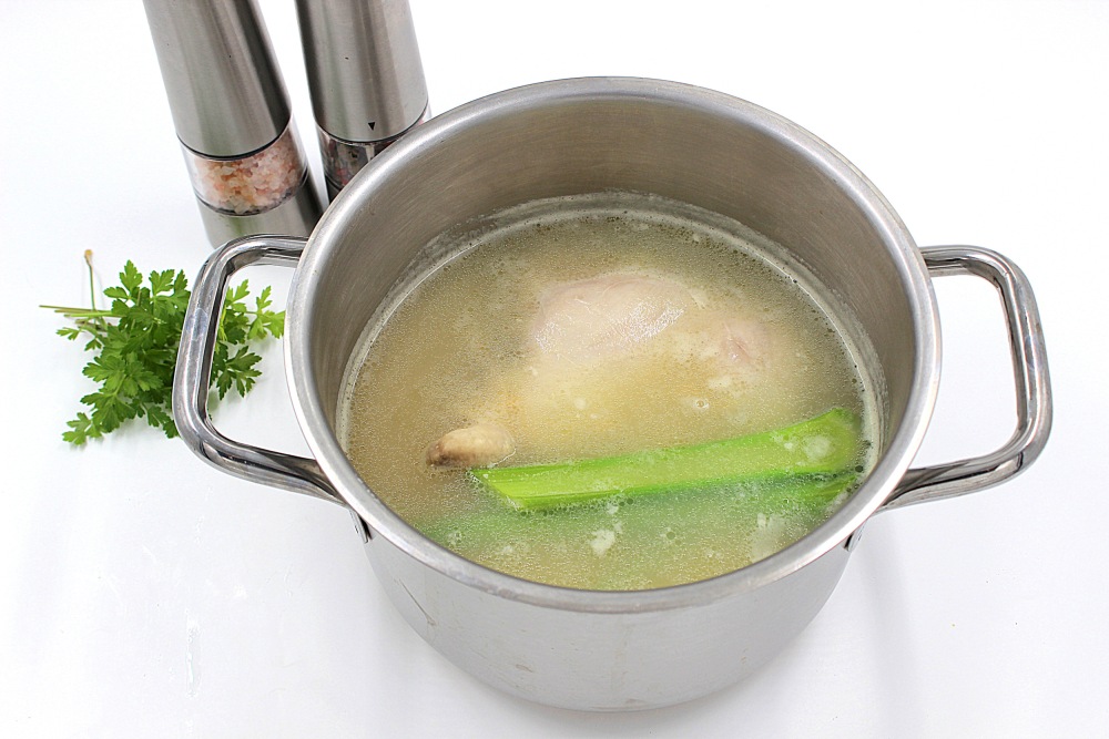 Уменьшить огонь, добавить соль, сельдерей и варить минут 30-40.