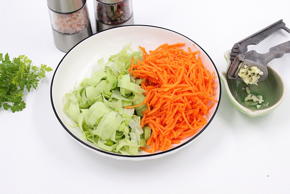 Нарезать лук-порей, морковь и измельчить чеснок.