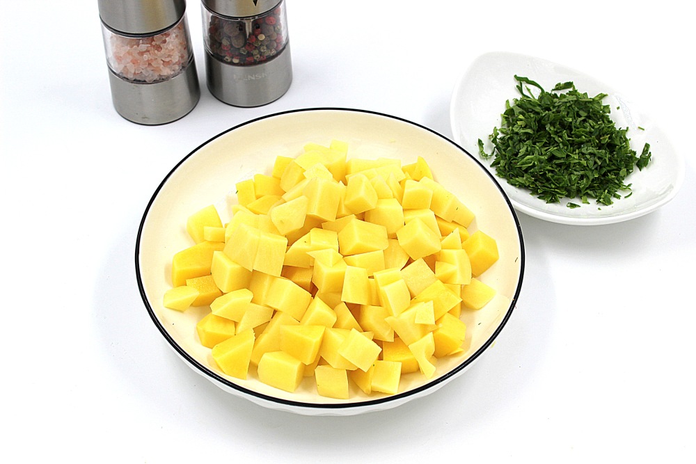 Очистить и нарезать довольно мелким кубиком картофель и измельчить зелень.