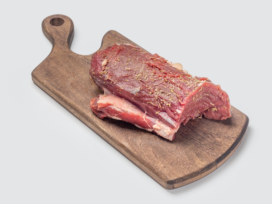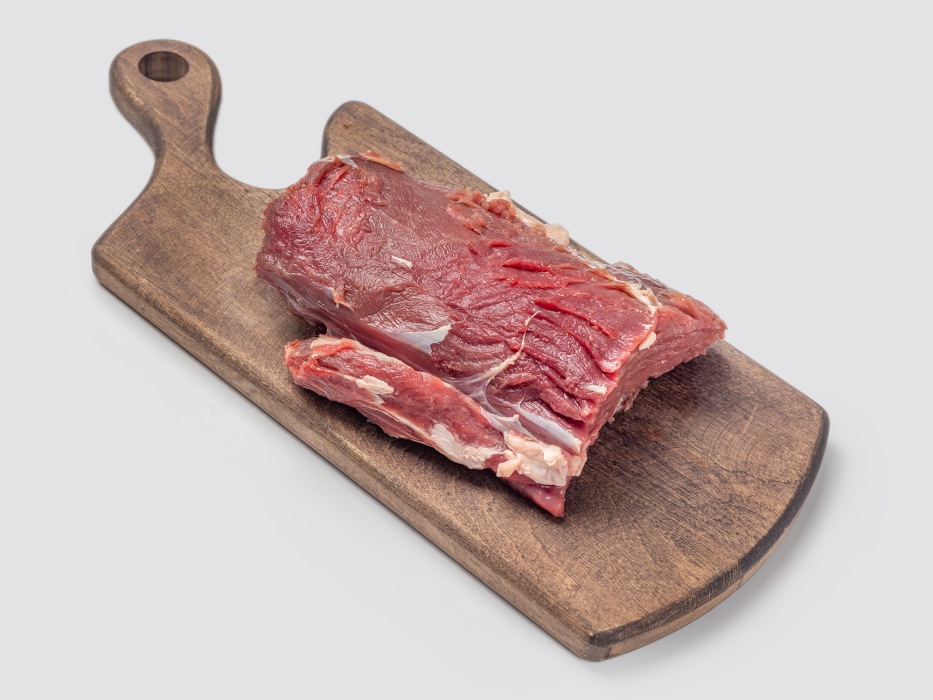 С мясной вырезки срезать жилки и фасции. Нужно сформировать плотный, четкой формой брусочек вырезки.