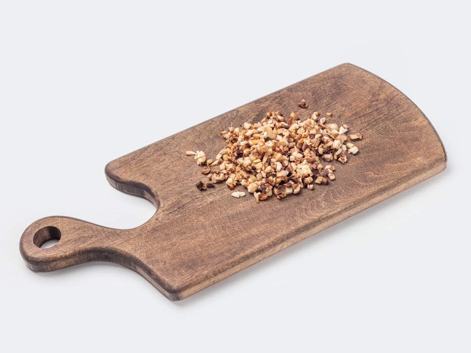 Нарезать грибы. Грибы стоит резать очень мелко. Нам нужен плотный дюксель, чтобы в нем не было сока.