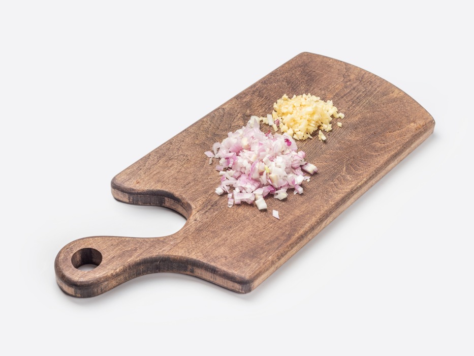 Мелко нарезать лук и чеснок. Для приготовления говядины “Веллингтон” возьмите именно лук шалот. Так блюдо получится еще нежнее на вкус.