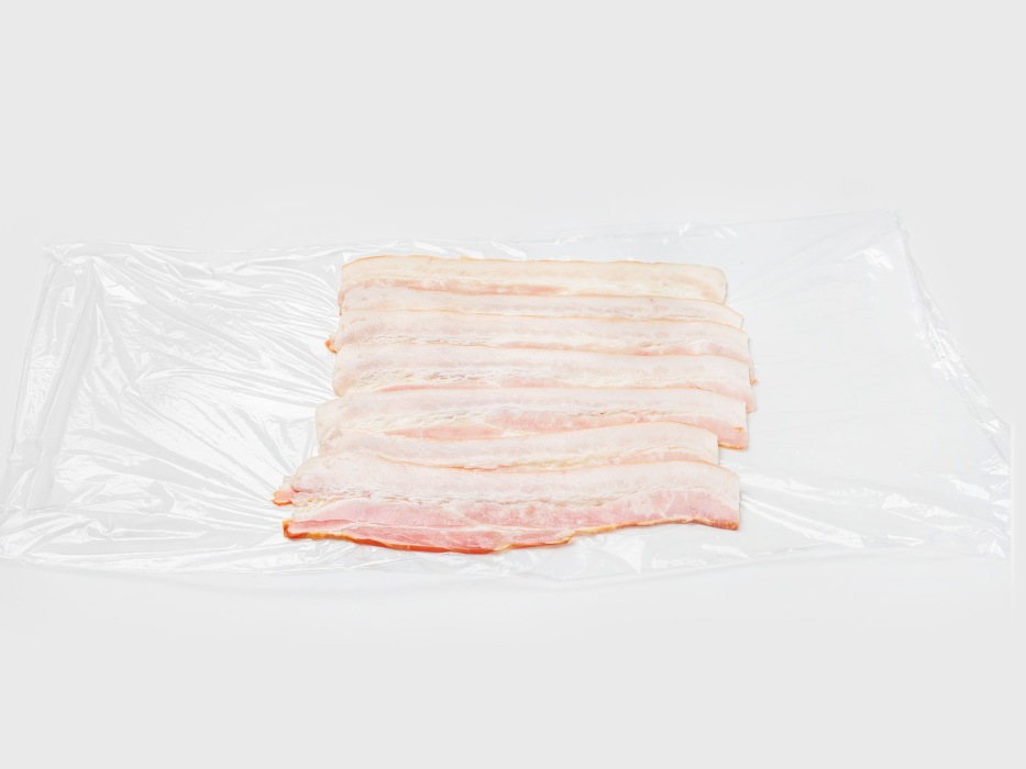 На растеленную в 2 -3 слоя пищевую пленку выложить бекон.