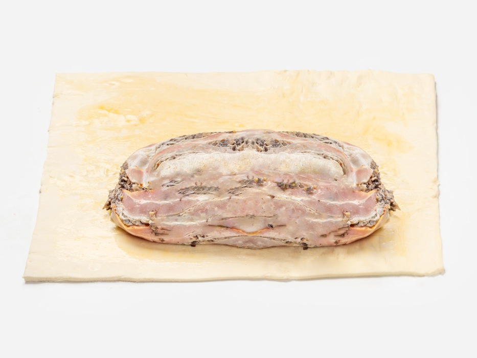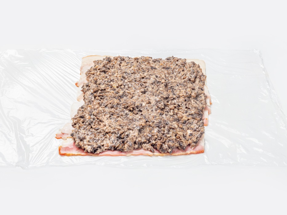 Выложить на слой бекона грибной дюксель и равномерно распределить его по поверхности.
