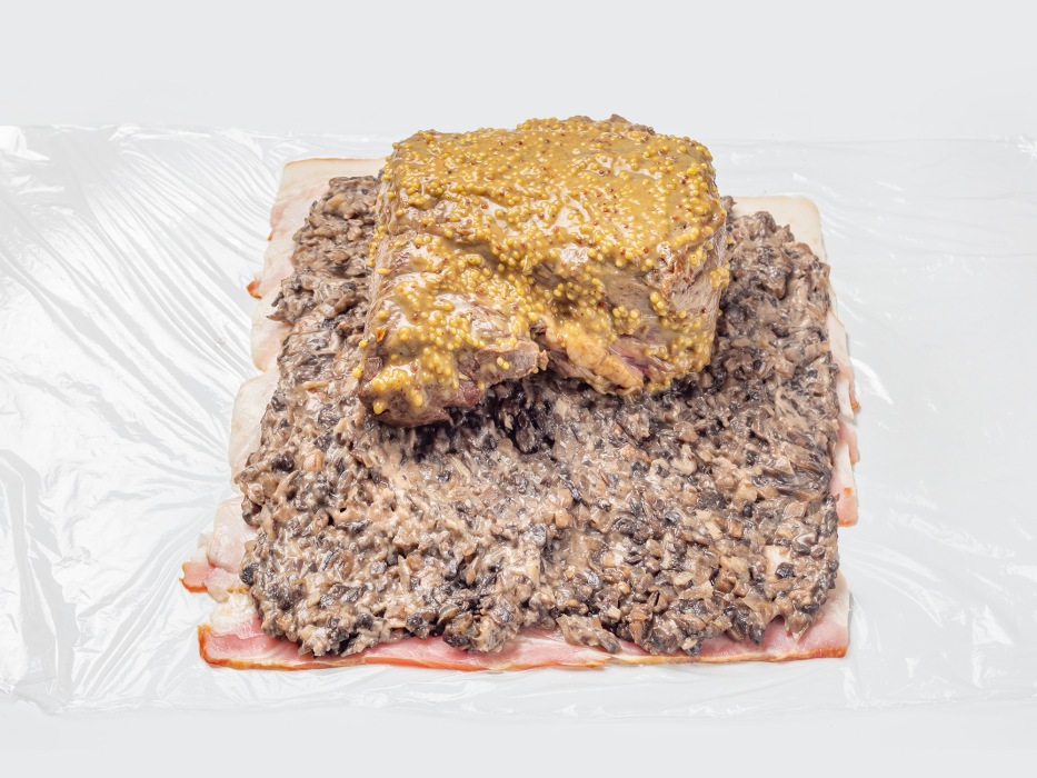 Выложить на слой бекона грибной дюксель и распределить его по поверхности.