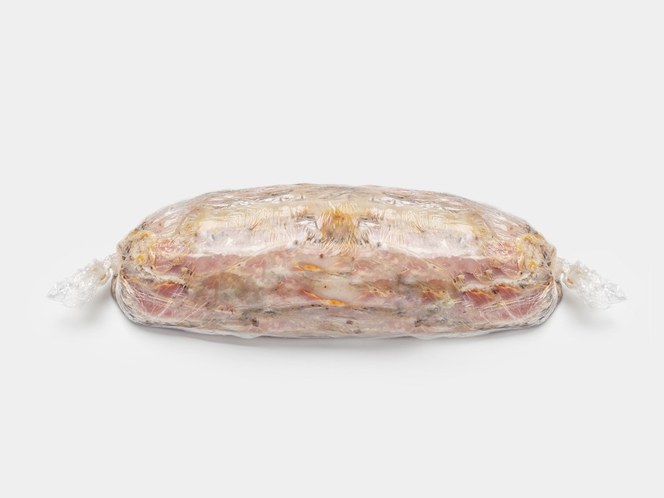 С помощью пленки как можно туже свернуть начинку в рулет. Плотно закрепить края пленки резинками. Оставить охлаждаться рулет в холодильнике в течение 30 минут, чтобы форма зафиксировалась.