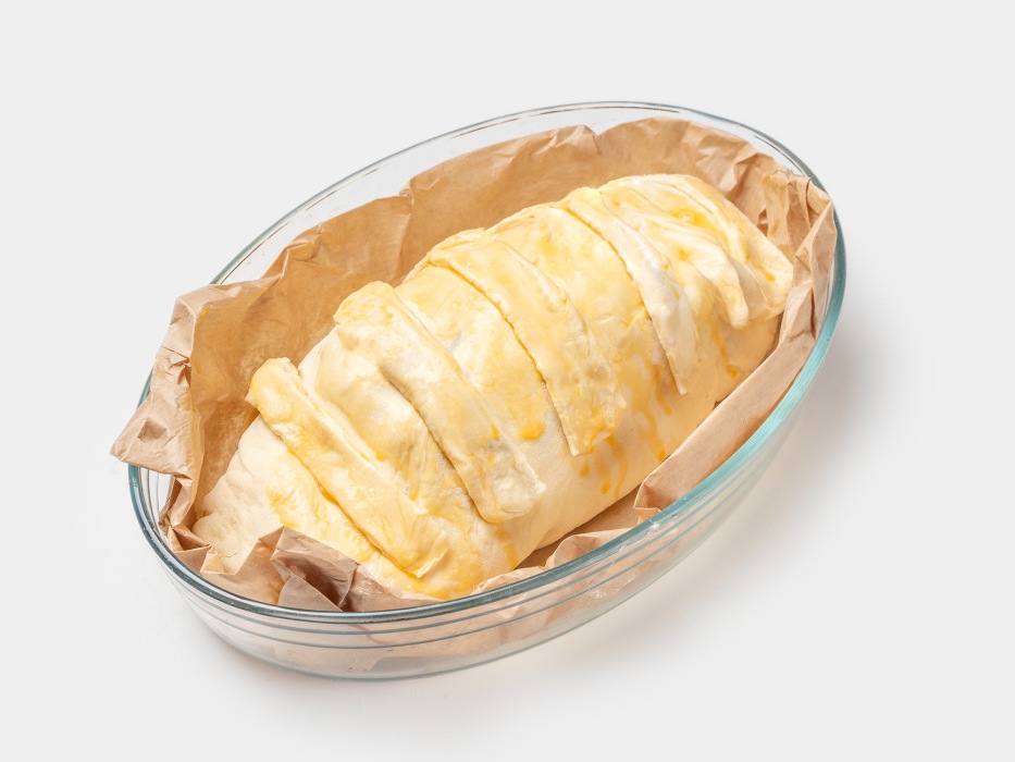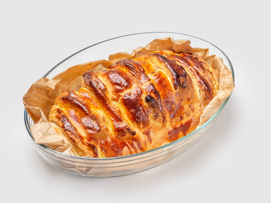 Выложить говядину “Веллингтон” в форму для выпечки швом вниз. Из оставшегося теста сформировать полосы, выложить их сверху и смазать получившийся пирог оставшимся желтком.