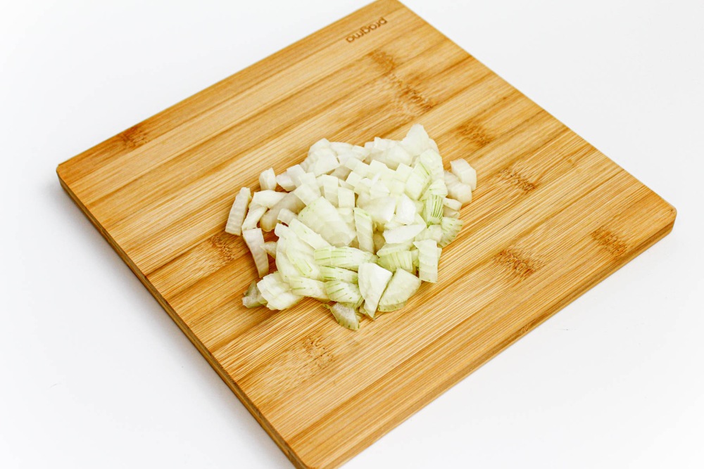 Лук очистить от шелухи, а затем нарезать его аккуратными кубиками.