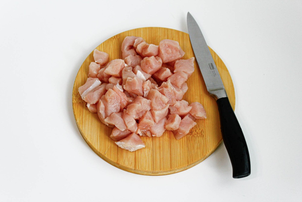Взять подготовленное мясо, промыть его и обсушить на одноразовой салфетке. Нарезать кубиками или брусочками среднего размера.