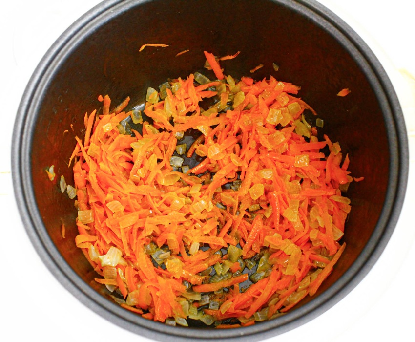 Смешать в чаше лук и морковь и обжарить в течение 10 минут. Режим "жарка".