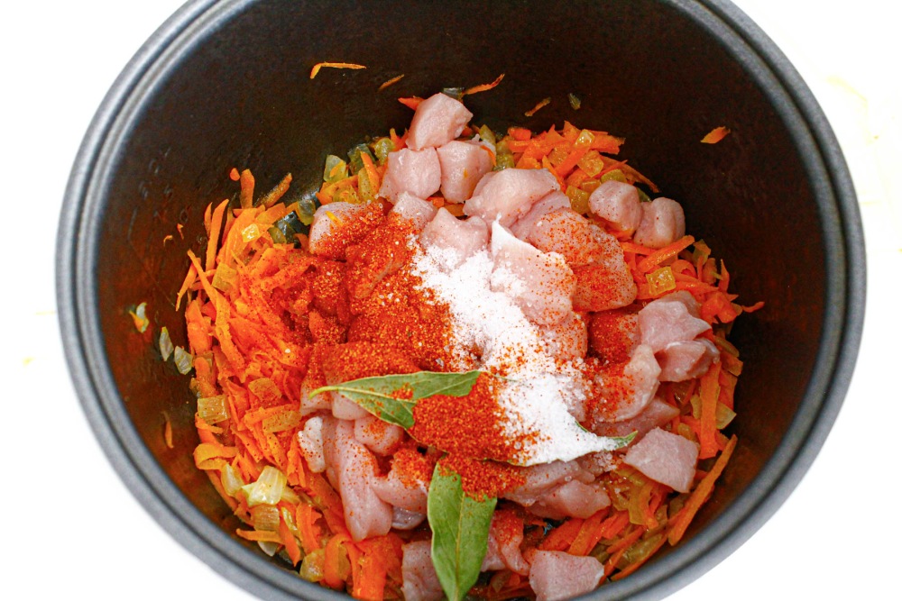 Добавить нарезанные кусочки свинины к овощам. Добавить соль и специи с лавровым листом по вкусу. Обжаривать все вместе еще 15 минут на режиме "жарка".