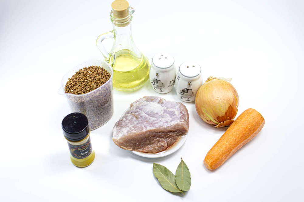 Подготовить ингредиенты для приготовления гречки со свининой на сковороде. Выбрать качественное мясо средней жирности (шея или лопатка). Лучше всего подойдет охлаждённая свинина. Гречку выбирать хорошего качества. Лук и морковь должны быть свежими.