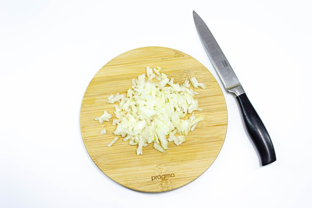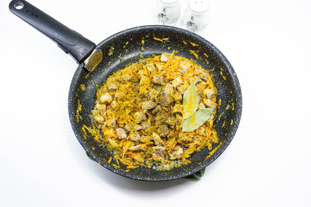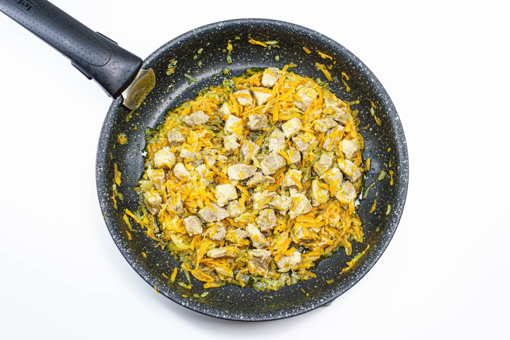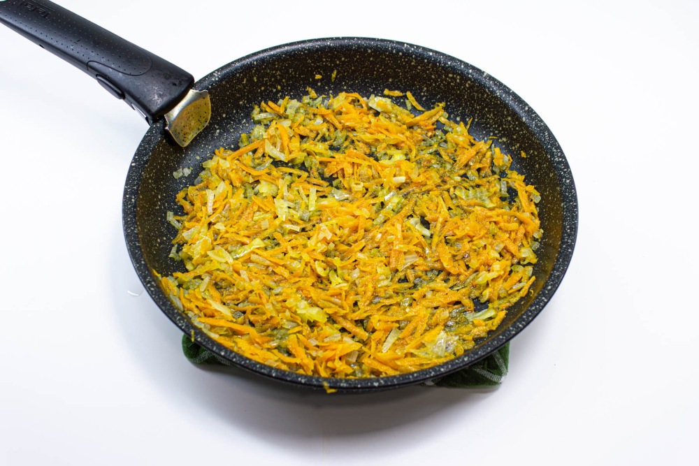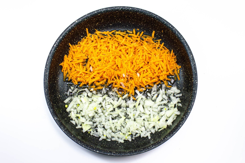 Добавить лук и морковь на сковороду. Перемешать и продолжать жарить 5-7 минуты до прозрачности лука.