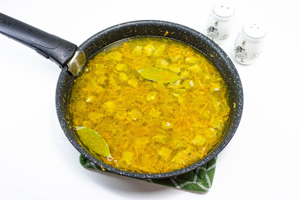 Посолить, поперчить, положить лавровый лист, добавить куркумы (по вкусу).