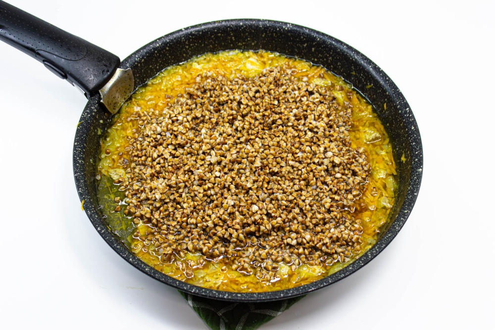 Промытую гречку высыпать в сковороду поверх мяса и овощей. Аккуратно распределить по всей сковороде.