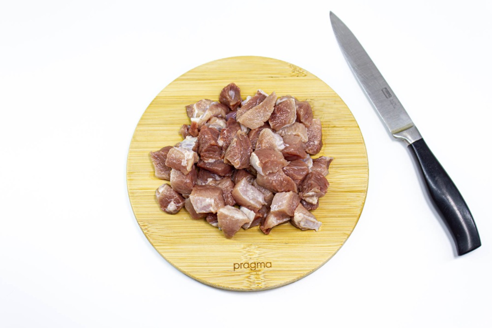 - Нарезайте мясо небольшими кусочками, так оно быстрее и равномернее прожарится