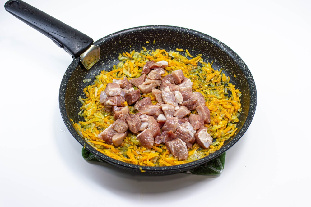 Мясо положить в раскалённую сковороду с луком и морковью и обжарить до полуготовности.
