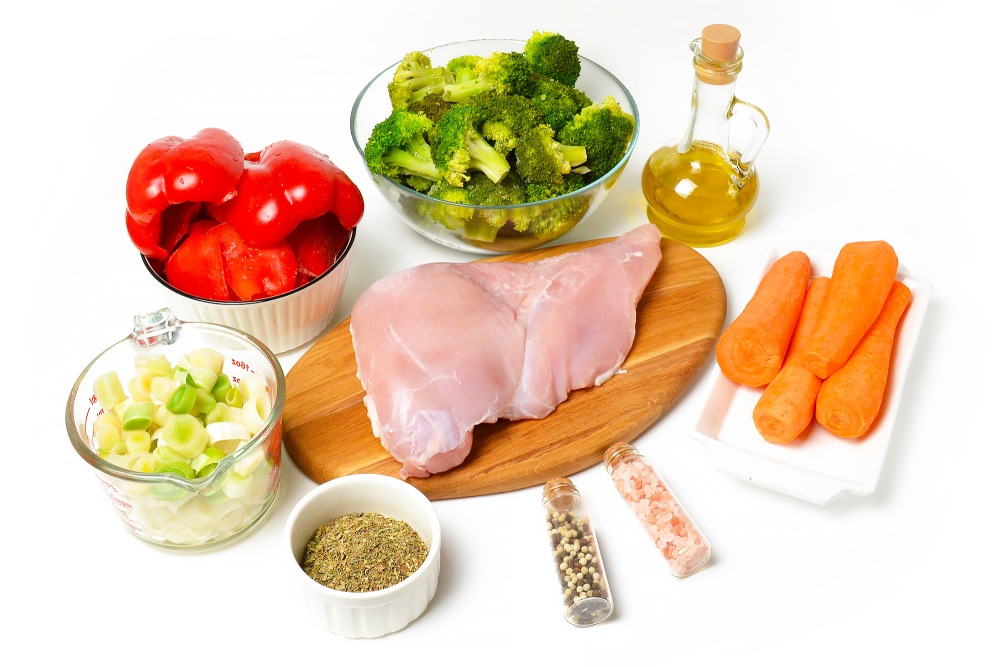 Подготовить ингредиенты: индейку, брокколи, морковь, сладкий перец, лук, оливковое масло, итальянские травы, соль и перец.