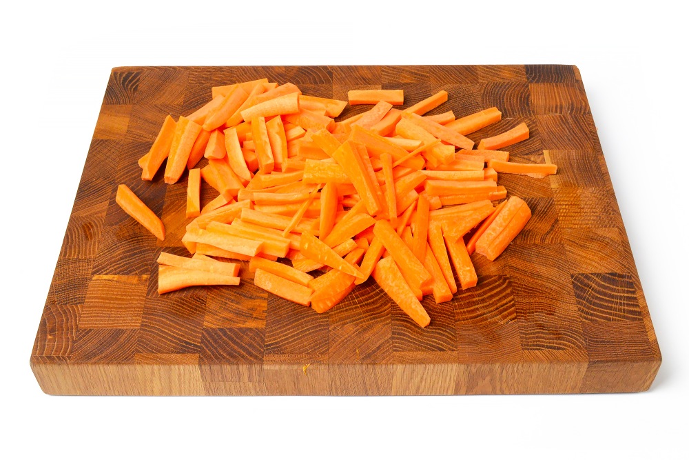 Брусочками длиной по 3-5 см нарезать морковь. Старайтесь, чтобы брусочки были не толстыми, по 0,5 см. Так, морковь пропечется быстрее и не будет сильно хрустеть к моменту, когда остальные овощи уже приготовятся.