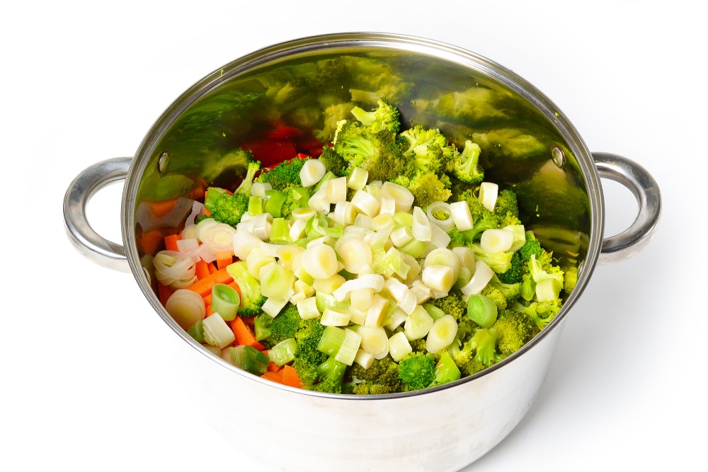 Смешать индейку с овощами в большой кастрюле, добавить лук-порей.