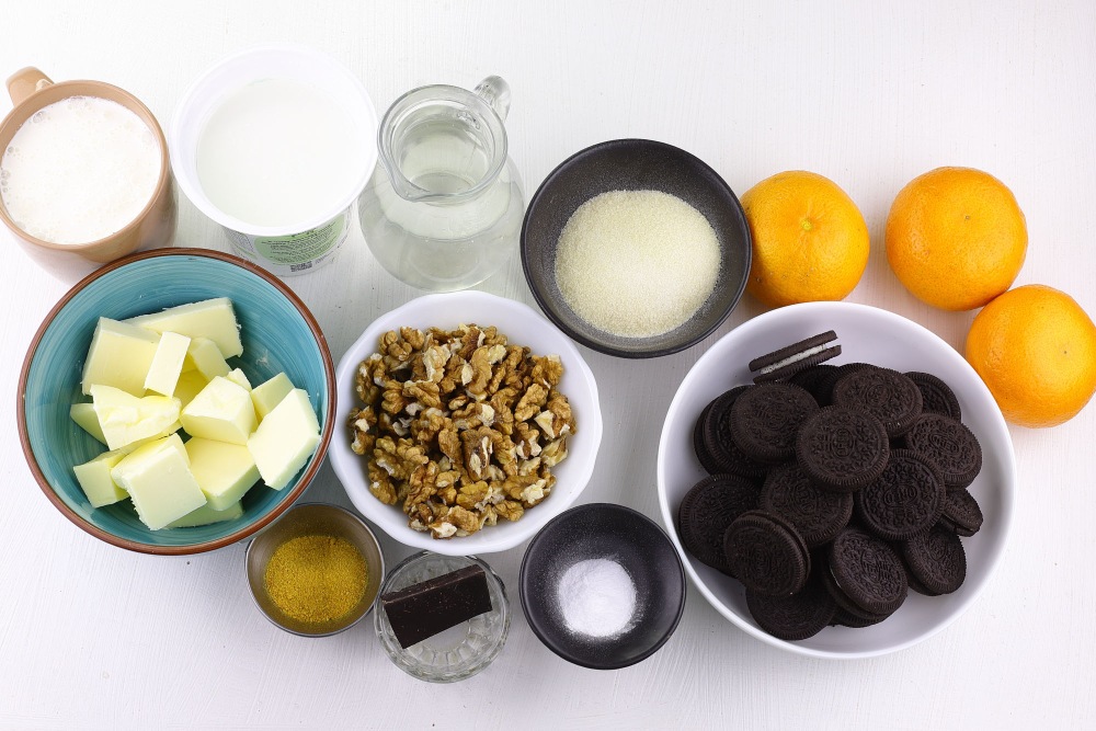 Подготовить необходимые ингредиенты для рецепта йогуртовый торт простой без выпечки. Для основы я использую печенье орео. Оно создаст эффектный контраст между темным шоколадным низом и светлым йогуртовым желе. Также отлично подойдет классическое песочное печенье, овсяное, савоярди, имбирное.