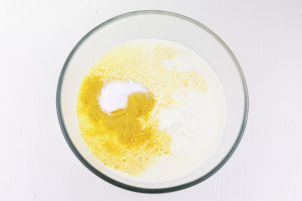 В глубокую миску добавить йогурт, сливки (комнатной температуры), цедру, подсластитель. Вместо цедры отлично подойдет ванильный экстракт или другой ароматизатор. Вместо подсластителя (у меня стевия) можно взять сахарную пудру или сахар по вкусу.
