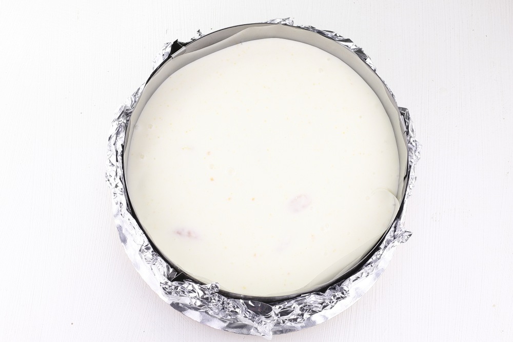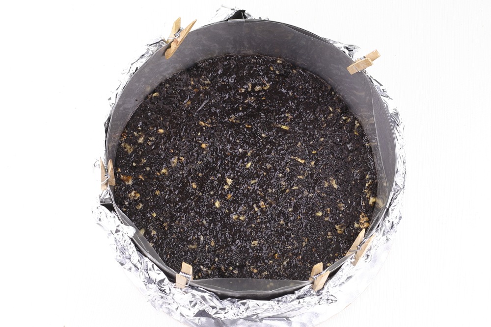 Подготовить форму. Я использую кольцо диаметром 22 см и высотой 8 см. Дно застелить фольгой в два слоя, захватывая боковые стороны. Установить кольцо на доску или плоскую тарелку. Внутреннюю часть я застелила ацетатной пленкой. Всыпать крошку. Разровнять ложкой и утрамбовать. Для трамбовки можно взять картофелемялку или плоский стакан. Отправить в морозильную камеру на 25-30 минут, чтобы основа стала плотнее.