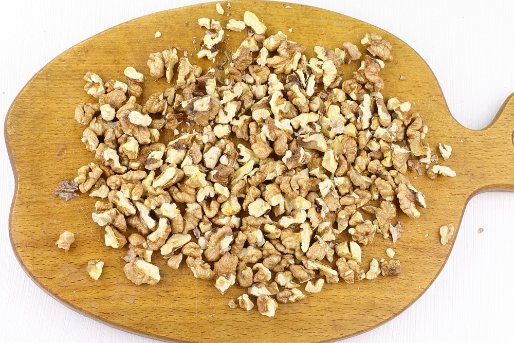 Грецкие орехи нарезать мелкими кусочками. Для усиления аромата и хруста, прогреть 5-7 минут на среднем огне до появления характерного орехового аромата и легкого золотистого оттенка на сухой сковороде.