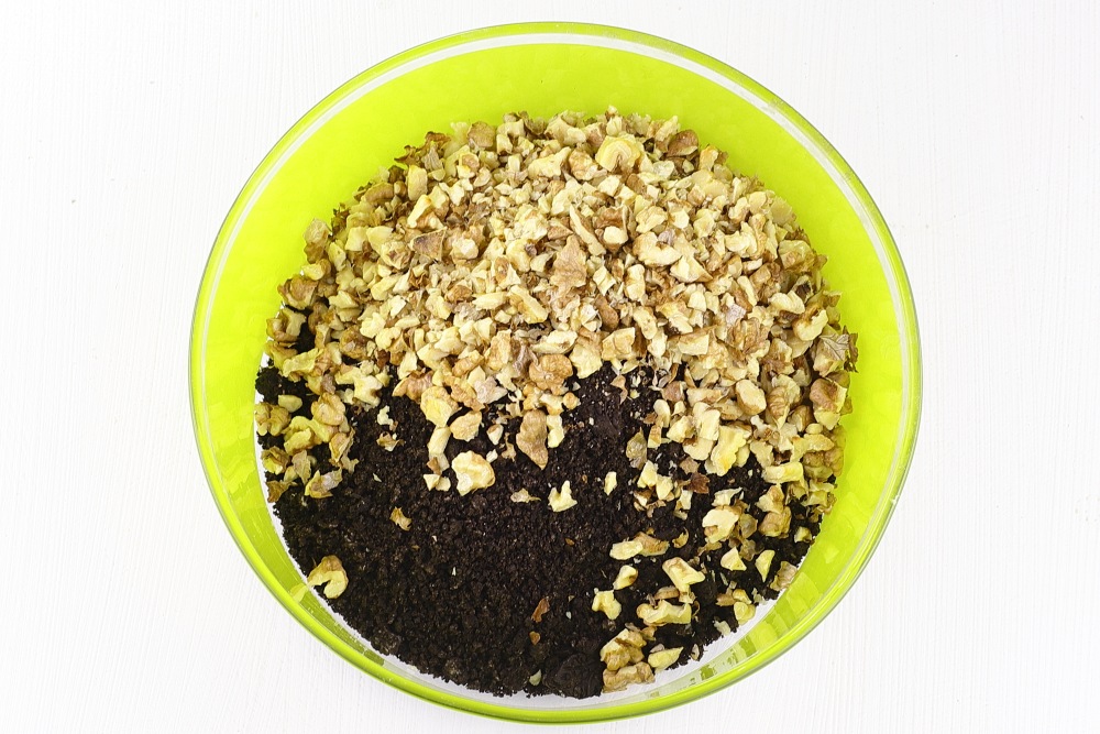 Печенье поместить в чашу измельчителя (блендера) вместе с кремовой прослойкой. Измельчить до состояния мелкой, однородной крошки. Пересыпать измельченное печенье в глубокую миску. Всыпать туда же подготовленные орехи и тщательно перемешать сухие ингредиенты между собой.