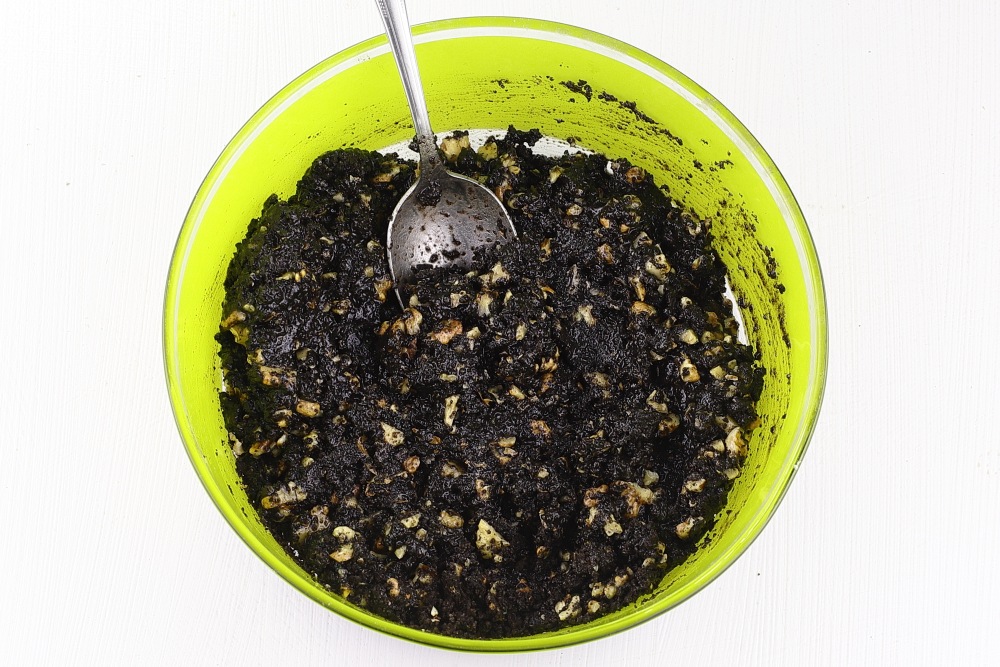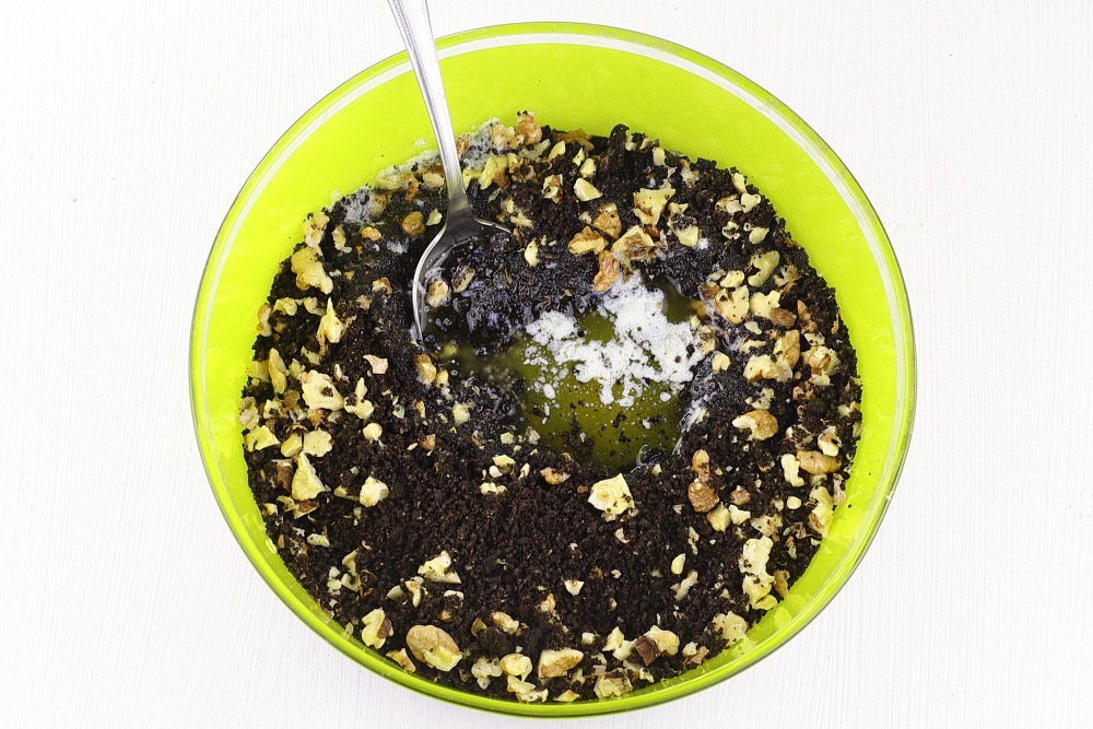 Тщательно перемешать массу ложкой или лопаткой, чтобы не осталось сухой крошки. Весь песочно-ореховый слой должен равномерно пропитаться маслом. По консистенции масса будет напоминать влажный морской песок.