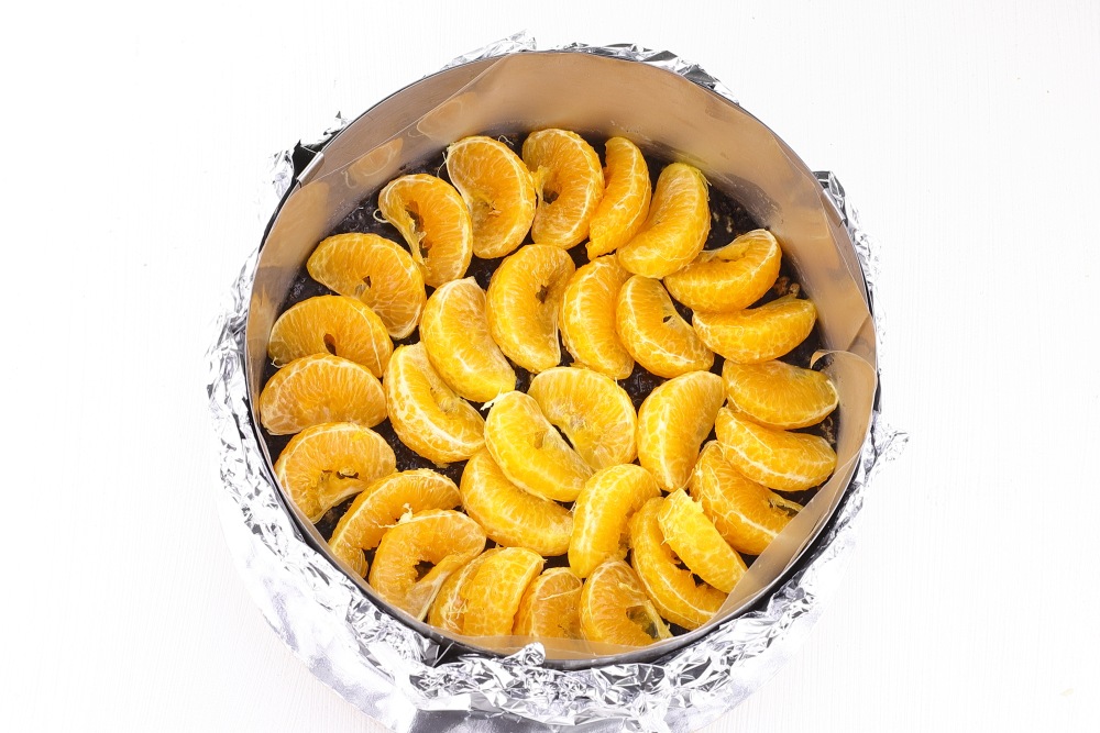Мандарины очистить от кожуры. Разделить на дольки. При необходимости, аккуратно, извлечь косточки. Выложить дольки на слой печенья в один слой.