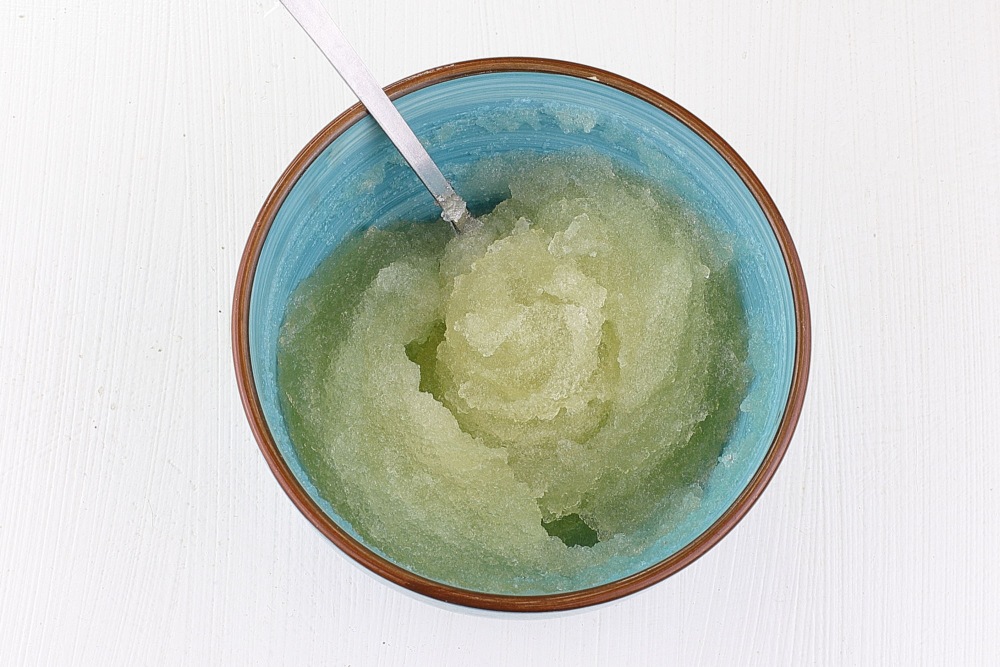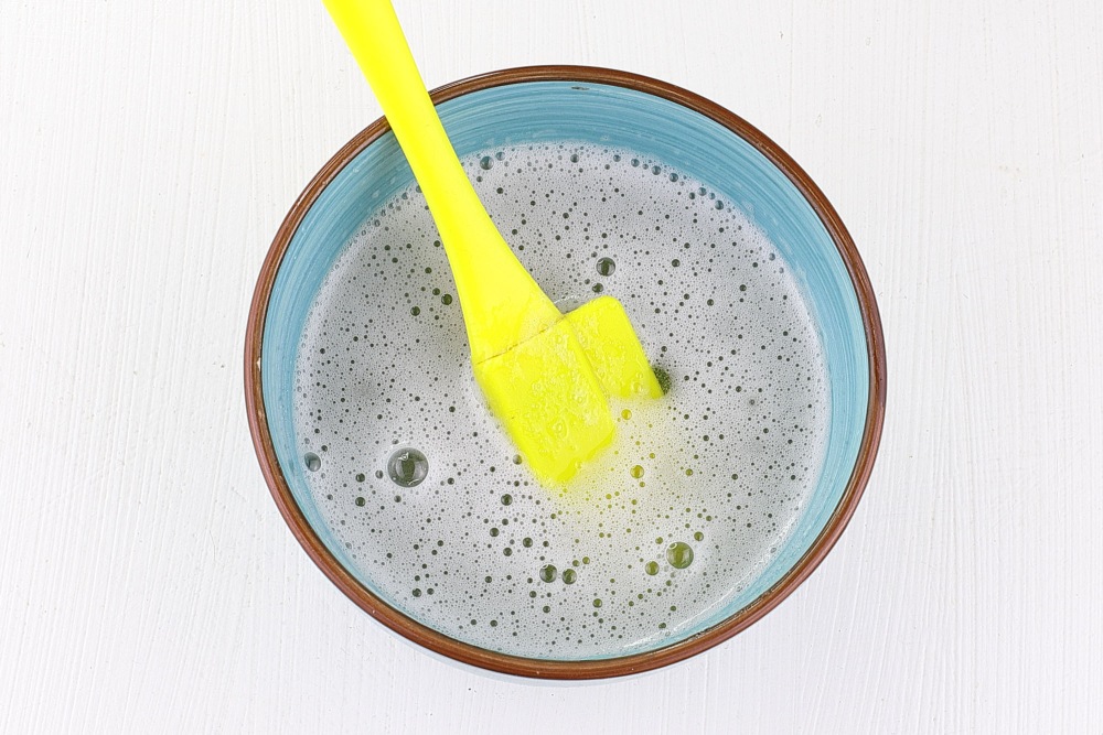 Растопить набухший желатин в микроволновке, используя короткие импульсы по 10–15 секунд при мощности 800 Вт. После каждого прогрева обязательно перемешать массу лопаткой. Как только крупинки полностью растворятся, оставить смесь на столе, чтобы она остыла до комнатной температуры.