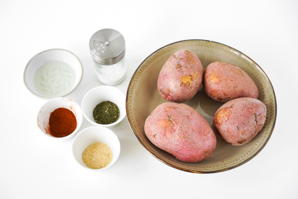 Подготовить ингредиенты. Для этого блюда лучше выбрать картофель красных сортов — он плотнее и меньше разваривается. Желательно брать клубни среднего размера, чтобы ломтики были удобны в нарезке и запекании.