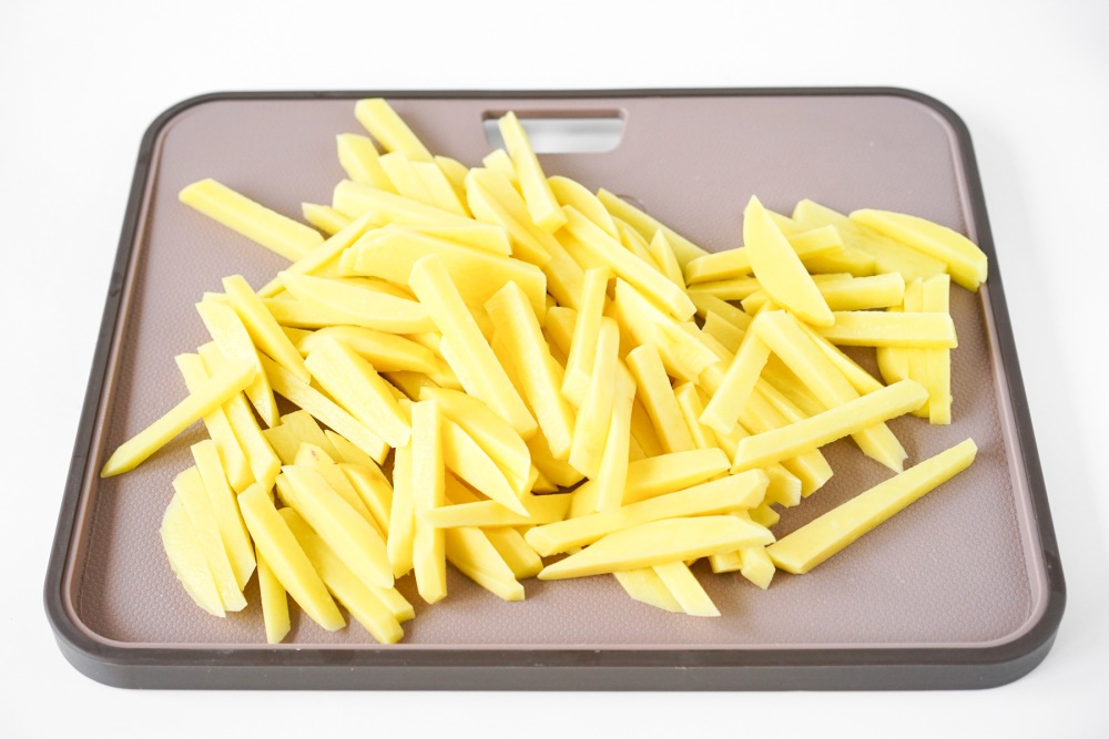 Разрезать клубни на длинные полоски толщиной примерно 0,7–1 см. Важно, чтобы все кусочки были одинаковыми — так они приготовятся равномерно. Можно использовать специальный нож для картофеля фри, тогда ломтики будут одинаковой формы.