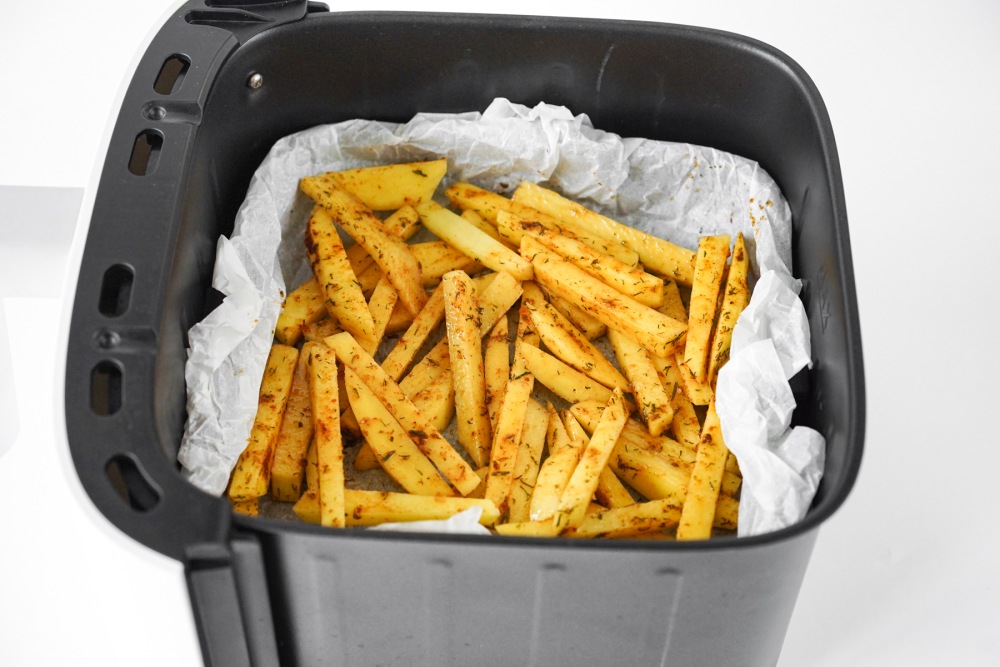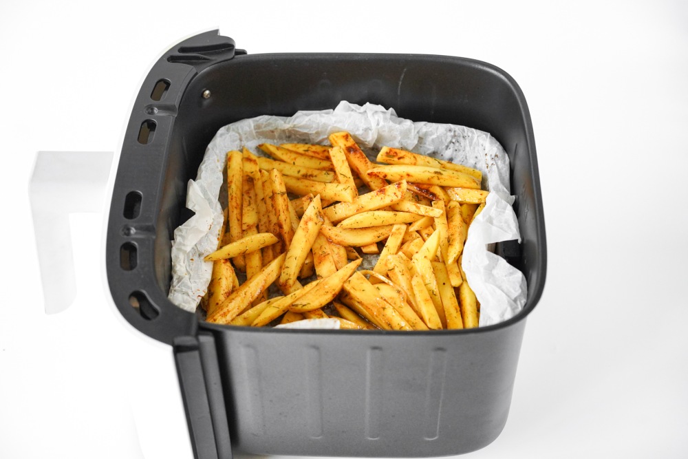 Выложить половину ломтиков в корзину аэрогриля в один слой. Если положить слишком много сразу, картофель не подрумянится равномерно. При желании постелить пергамент с отверстиями, чтобы жир не капал вниз и корзина оставалась чище.