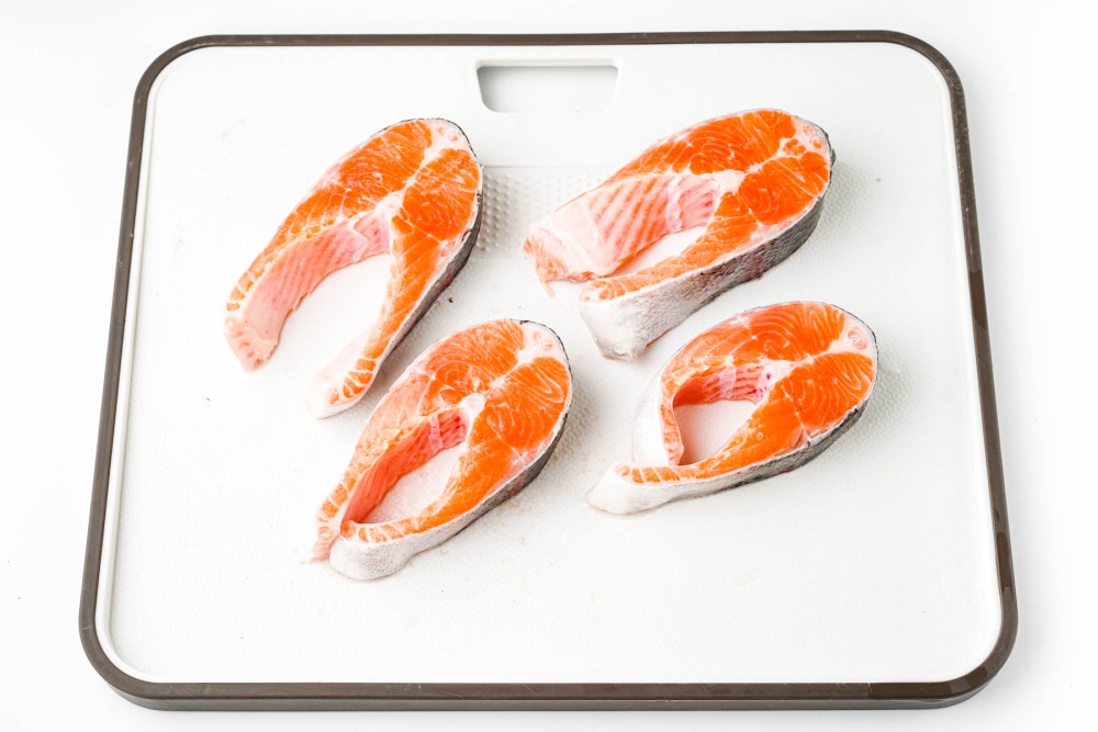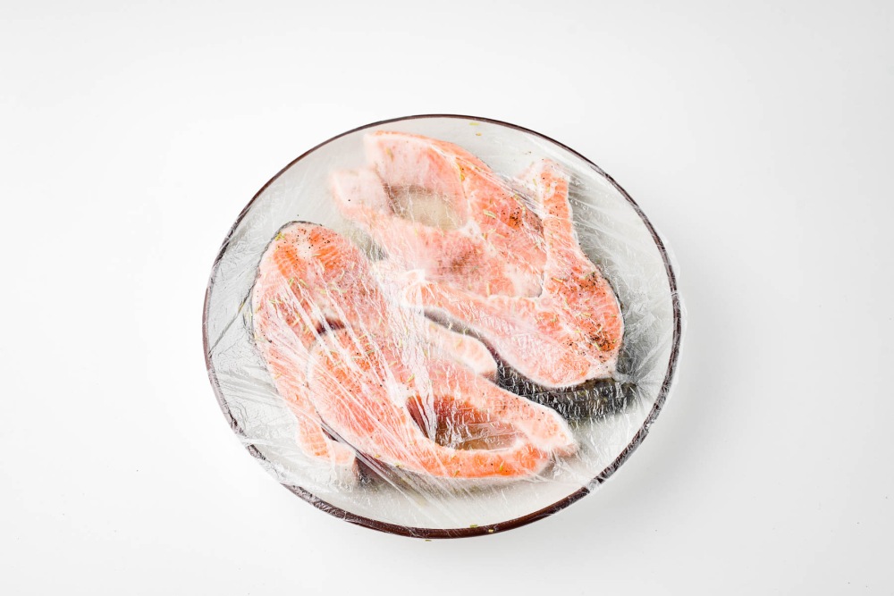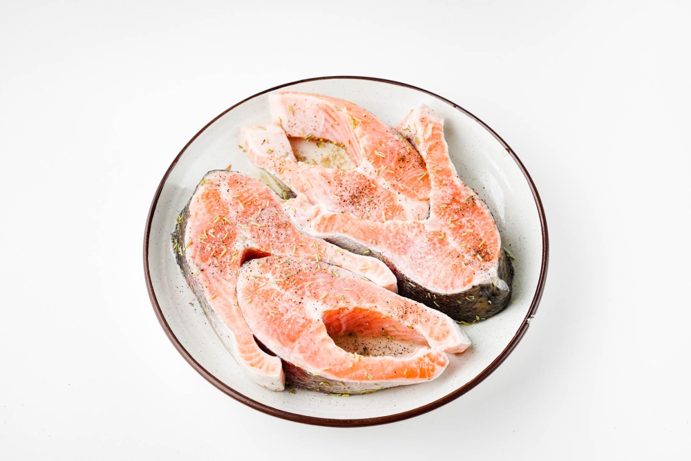 - Выбирать стейки толщиной 2-3 см, чтобы рыба осталась сочной.
