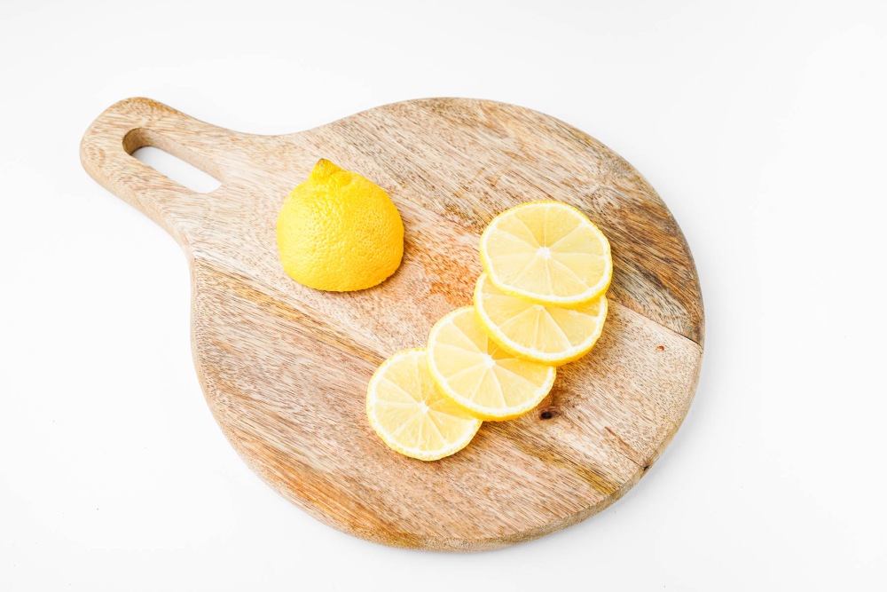 Тщательно промыть лимон горячей водой и обсушить. Разрезать его пополам. Одну половину нарезать тонкими кружочками одинаковой толщины, чтобы они равномерно пропеклись.