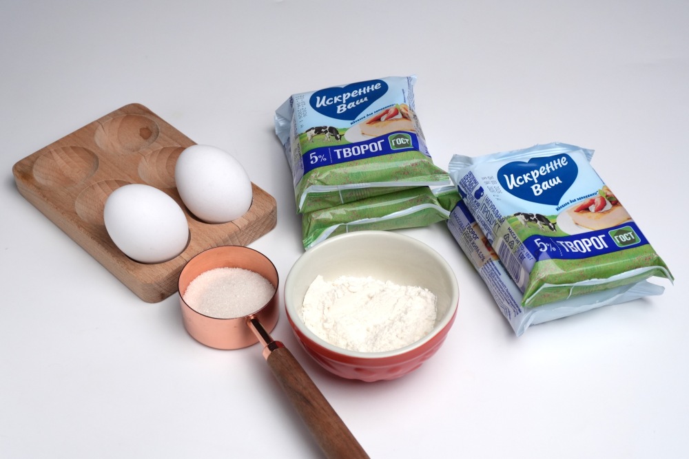 - Мука – 8 ст.л. (5 ст.л в творог, остальное для обсыпки)