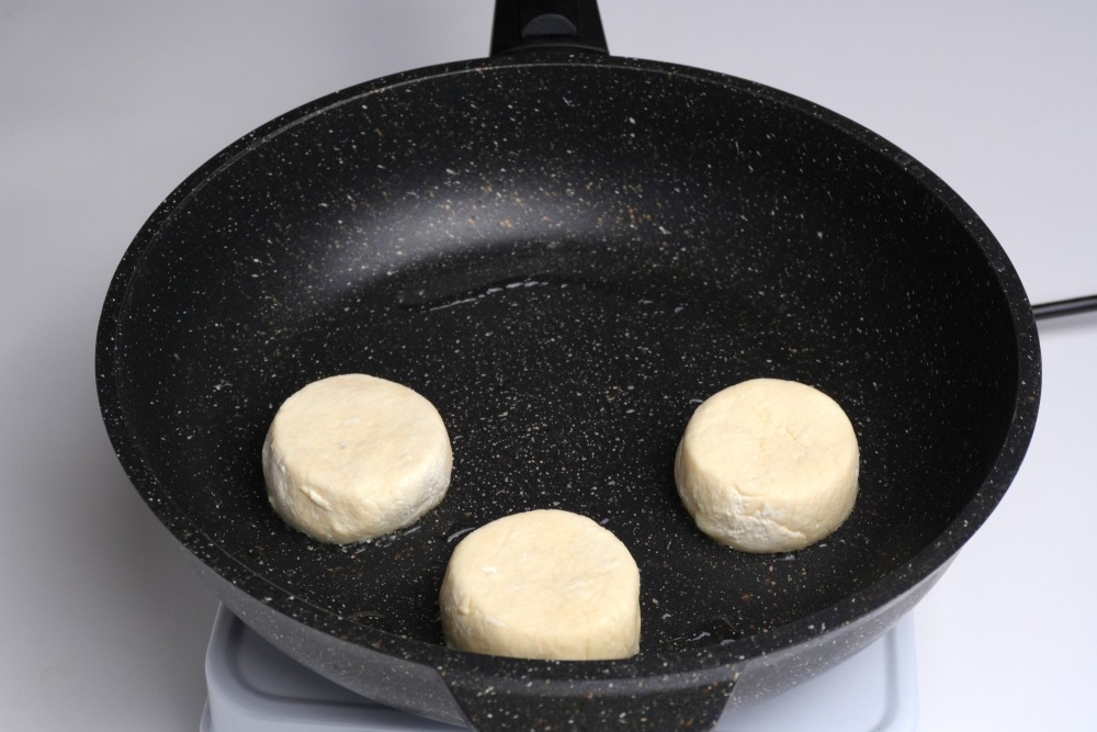 Как приготовить сырники на сковороде. Сырники перед жаркой лучше слегка разморозить, дать постоять при комнатной температуре 20 минут. Сковороду поставить на средний огонь, добавить немного растительного масла (1 ст.л). Сковороду лучше использовать тефлоновую. Выложить сырники в сковороду, огонь убавить до минимального.