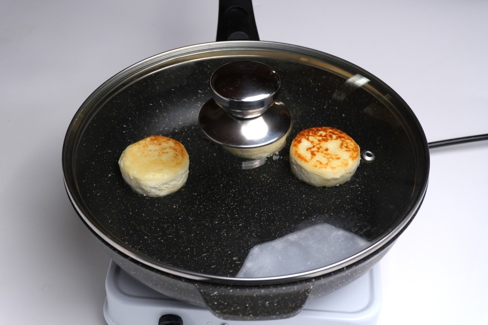 Когда сырники подрумянятся, аккуратно перевернуть их. Накрыть сковороду крышкой и держать сырники на минимальном огне еще 5 минут, затем огонь выключить. Подержать сырники под крышкой, чтобы они стабилизировались.