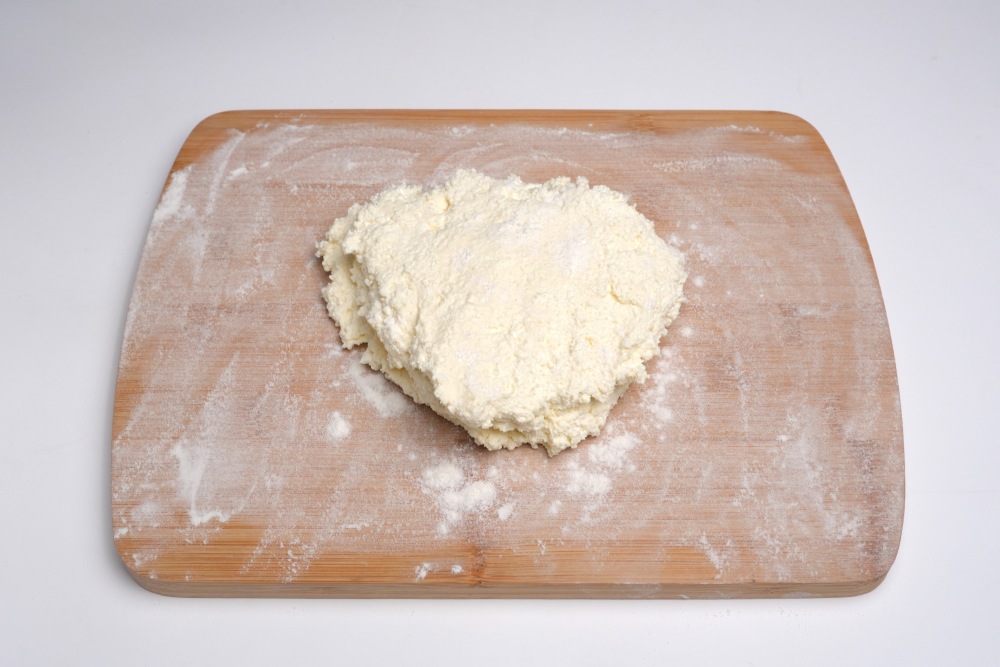 Добавить в творожную массу муку (5ст.л), перемешать и переложить на плоскую поверхность, присыпанную мукой. Творожное тесто хорошо обмять, чтобы оно получилось однородным и мягким.