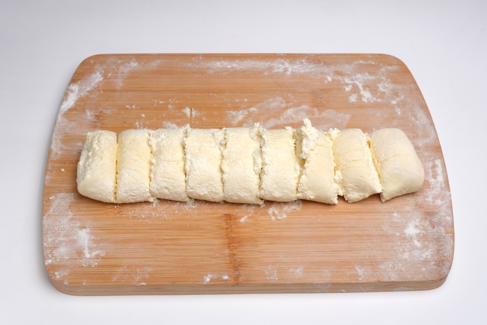 Раскатать толстую колбаску и разрезать на равные части, примерно по 2 см толщиной каждая. На 1 сырник примерно 1 столовая ложка с горкой творожного теста.